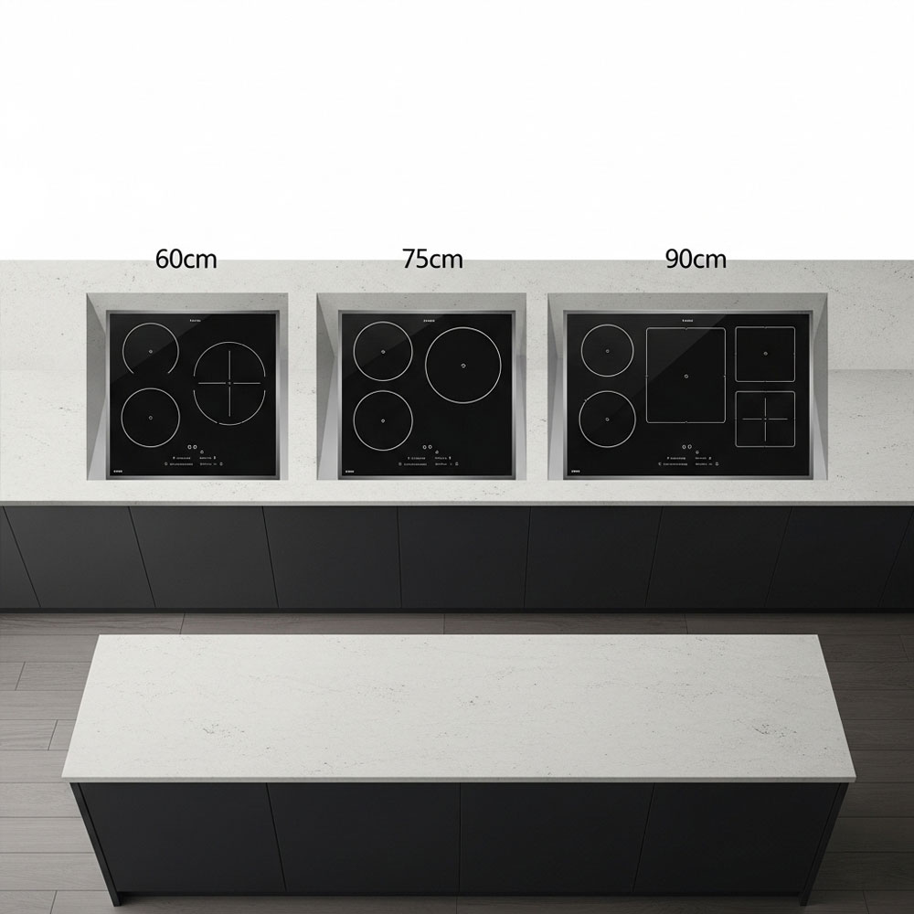 Phòng bếp của bạn có thể rộng hay nhỏ, nhưng bếp từ châu Âu luôn có lựa chọn phù hợp: bếp đôi, ba, bốn vùng nấu, hoặc loại dạng Domino để lắp linh hoạt. Kích thước hợp lý (ví dụ 60 cm, 75 cm, 90 cm) giúp tận dụng tối đa không gian, đồng thời giữ được vẻ cân đối và thanh lịch.