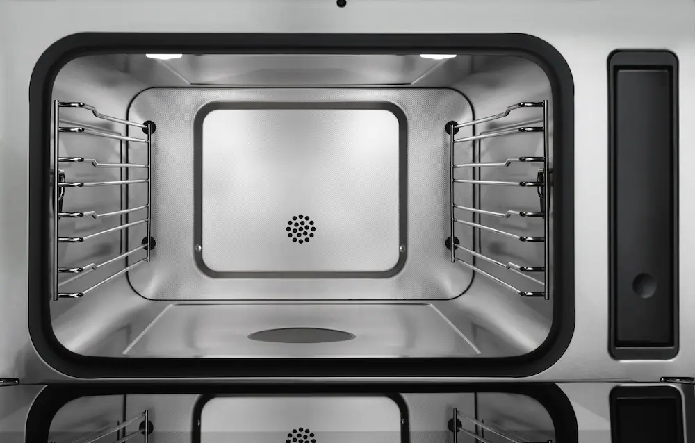 Bộ phận tạo hơi nước được đặt bên ngoài khoang lò. Trong quá trình nấu, hơi nước bay vào sẽ hoàn toàn lấp đầy khoang lò và chiếm chỗ của oxy. Điều này giúp làm nóng nhanh, nhiệt độ tối ưu và giữ được màu sắc tự nhiên của thực phẩm. Cặn vôi sẽ không thể tích tụ trong khoang lò nên việc vệ sinh đặc biệt dễ dàng.
