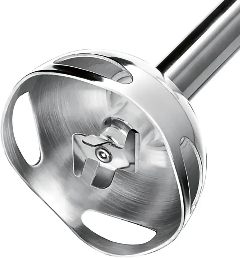 Máy được trang bị lưỡi dao 4 cánh QuattroBlade bằng thép không gỉ, giúp tăng diện tích tiếp xúc và tốc độ cắt thực phẩm. Nhờ thiết kế thông minh này, máy có thể xay nhuyễn cả những thành phần khó như thịt dai, đá lạnh hay các loại hạt khô.