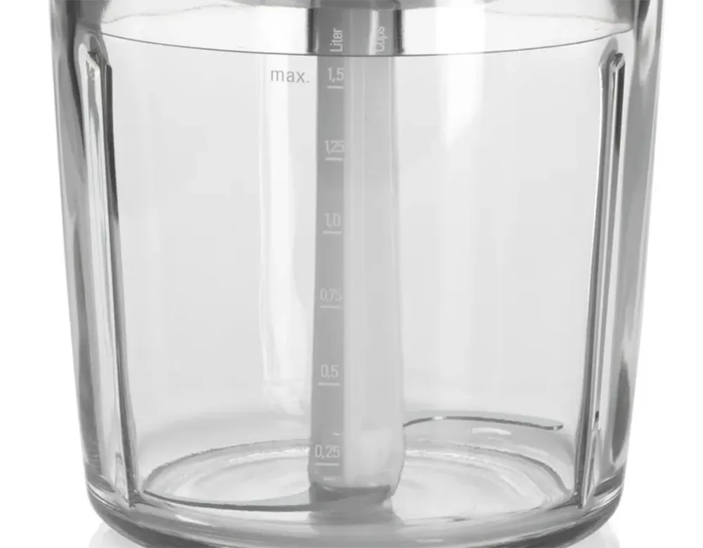 Cối xay được làm từ nhựa cao cấp trong suốt, cho phép người dùng quan sát quá trình xay một cách trực quan. Trên cối có vạch chia định lượng theo cả đơn vị lít và cups, hỗ trợ đo lường chính xác nguyên liệu trước khi chế biến.